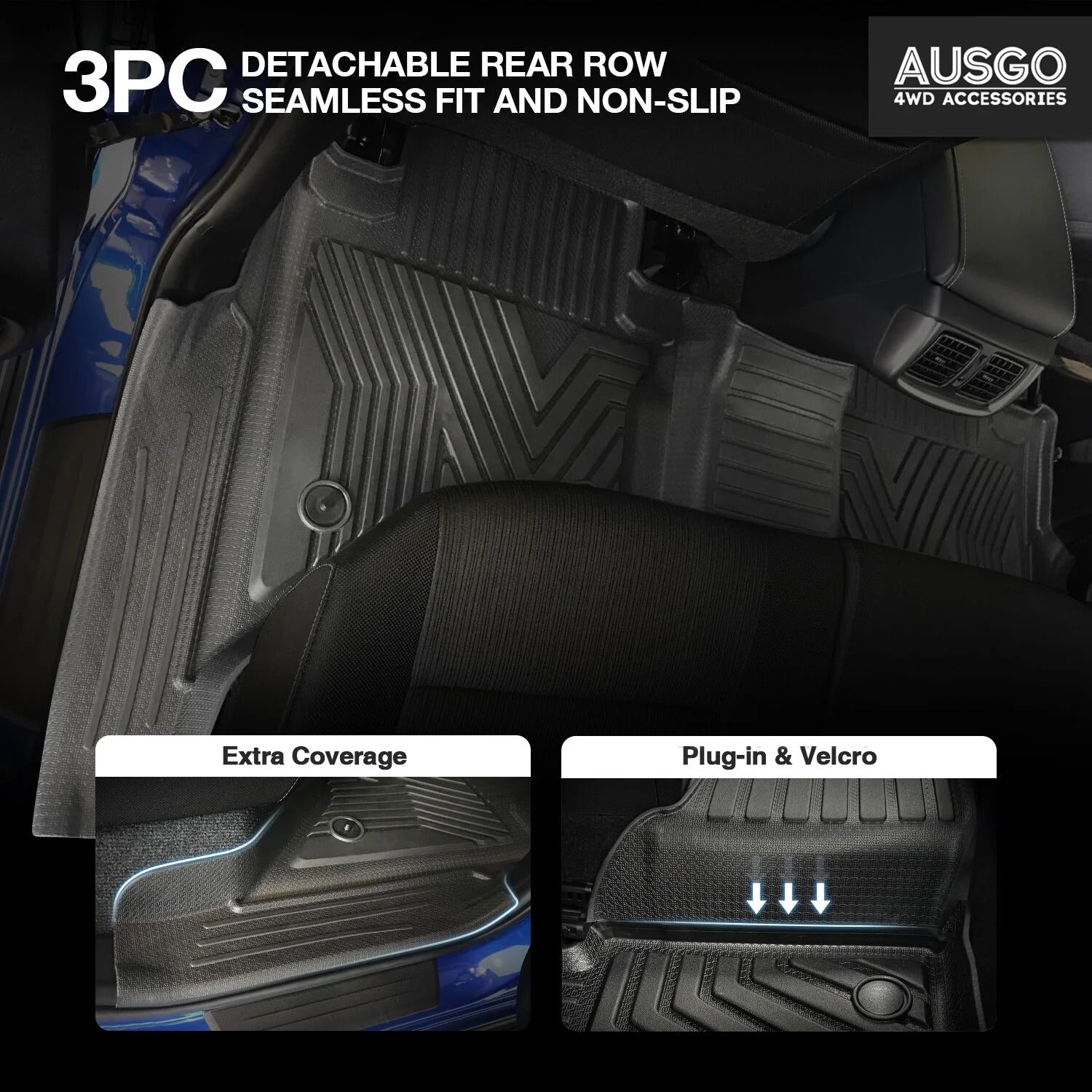 AUSGO outperforms OEM (Original Equipment Manufacturer) mats in fit, durability, and coverage. OEMs are the ones you get when you leave the showroom. While OEM mats typically provide basic cover, AUSGO mats are crafted from enhanced Thermoplastic Elastomer (TPE) materials that have superior wear and tear resistance, waterproofing, and longevity. Additionally, they cover more surface area — including the sides and edges of the vehicle’s door sills, under-seat areas, and footwells — which OEMs don’t.