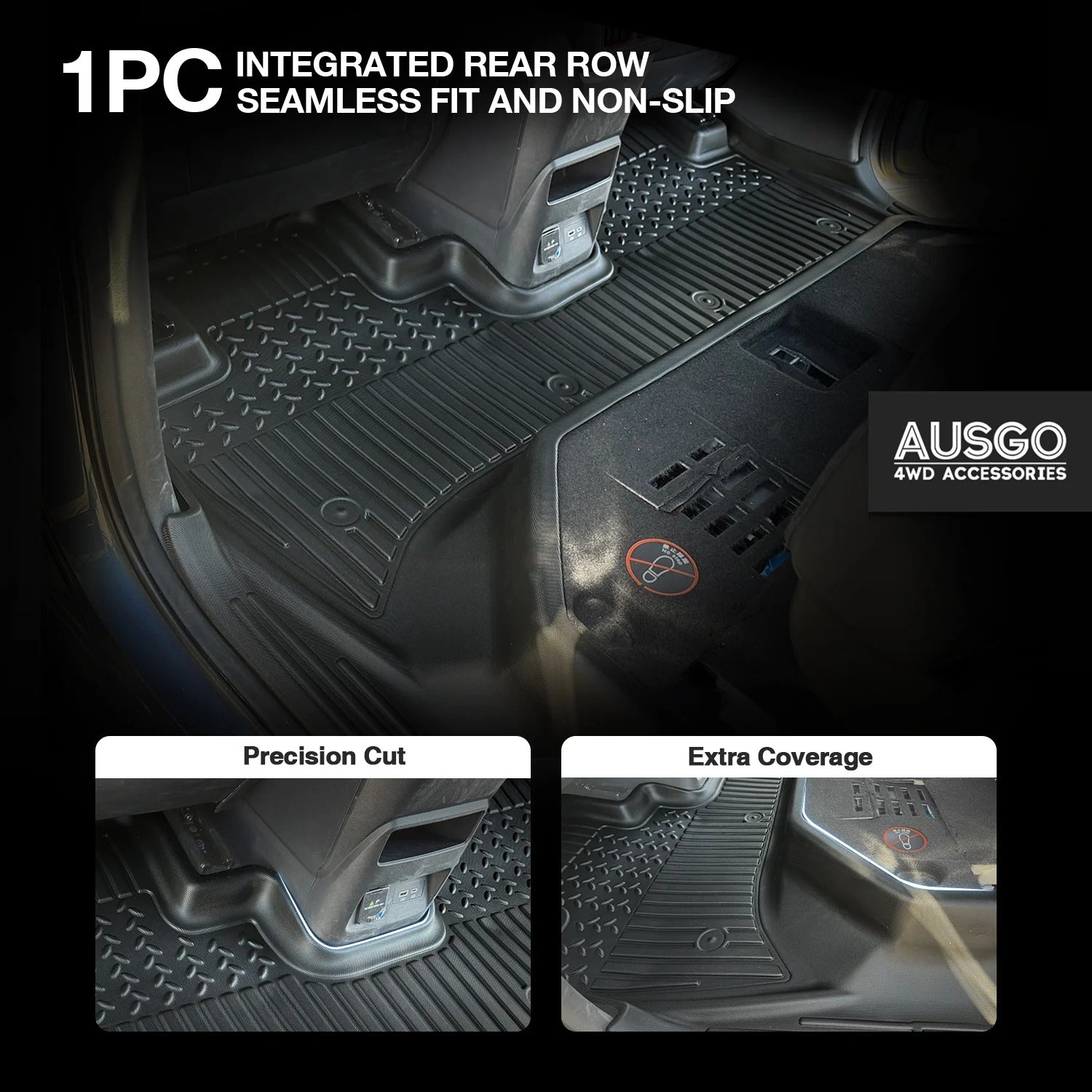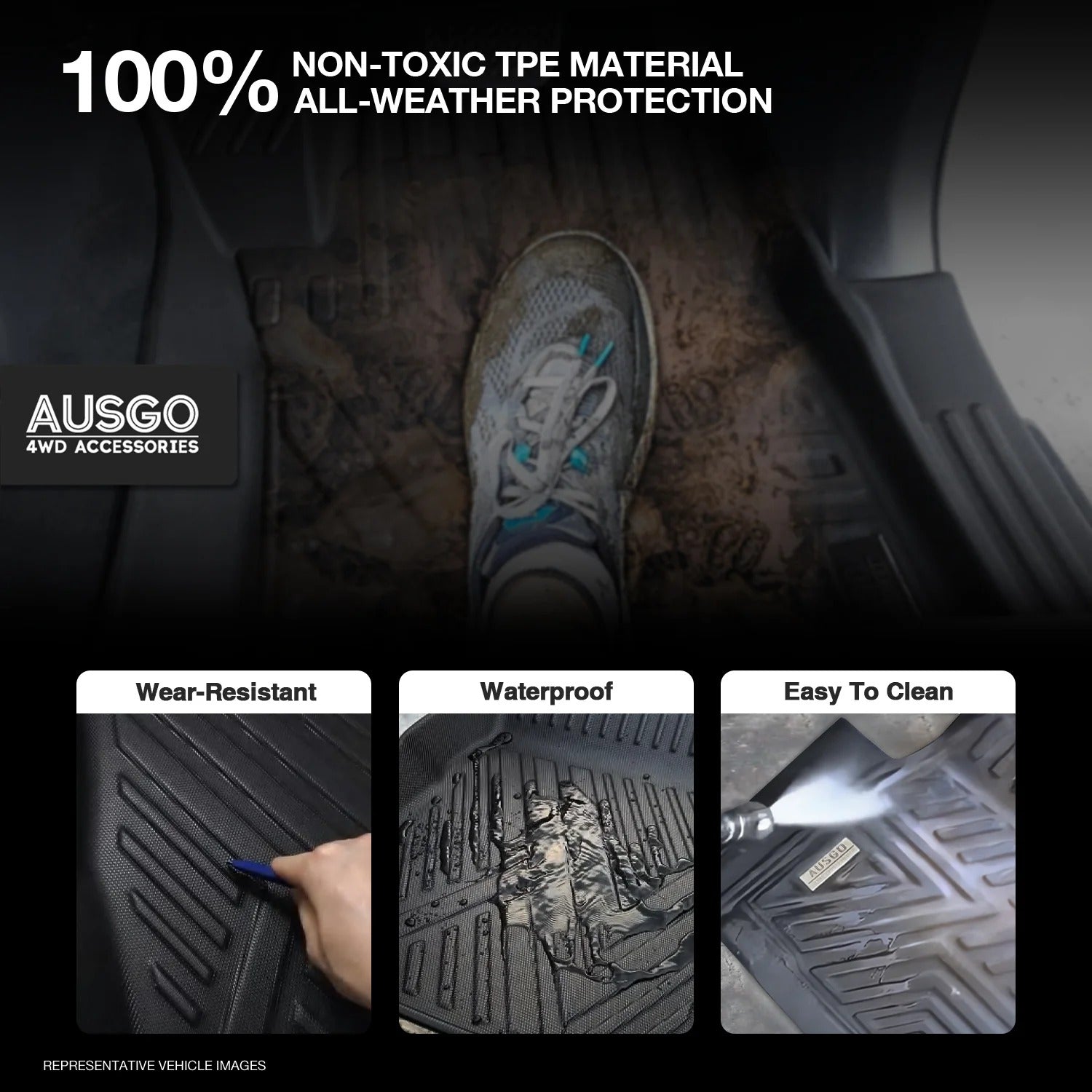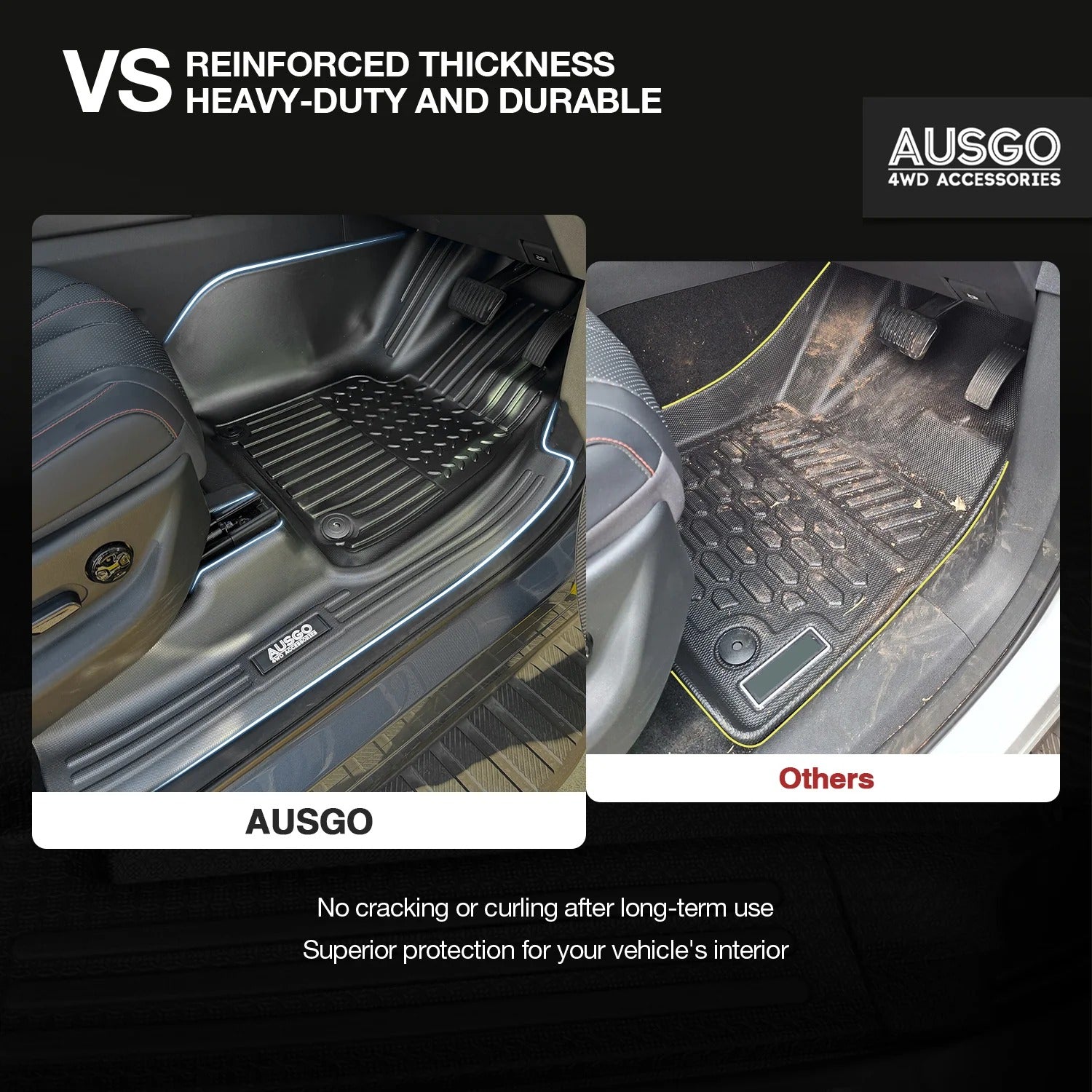 AUSGO outperforms OEM (Original Equipment Manufacturer) mats in fit, durability, and coverage. OEMs are the ones you get when you leave the showroom. While OEM mats typically provide basic cover, AUSGO mats are crafted from enhanced Thermoplastic Elastomer (TPE) materials that have superior wear and tear resistance, waterproofing, and longevity. Additionally, they cover more surface area — including the sides and edges of the vehicle’s door sills, under-seat areas, and footwells — which OEMs don’t.