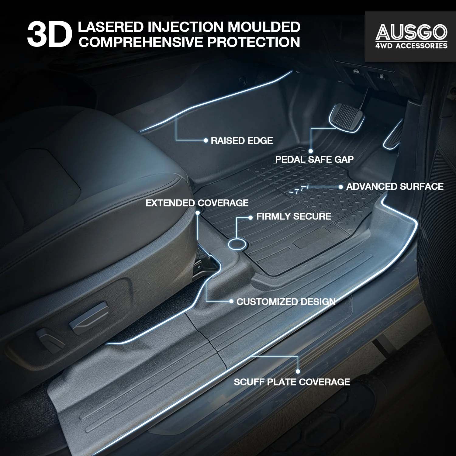 • Perfect Fit: Laser-measured and injection-moulded to precisely cover the floor, edges, door sills, and under-seat areas.