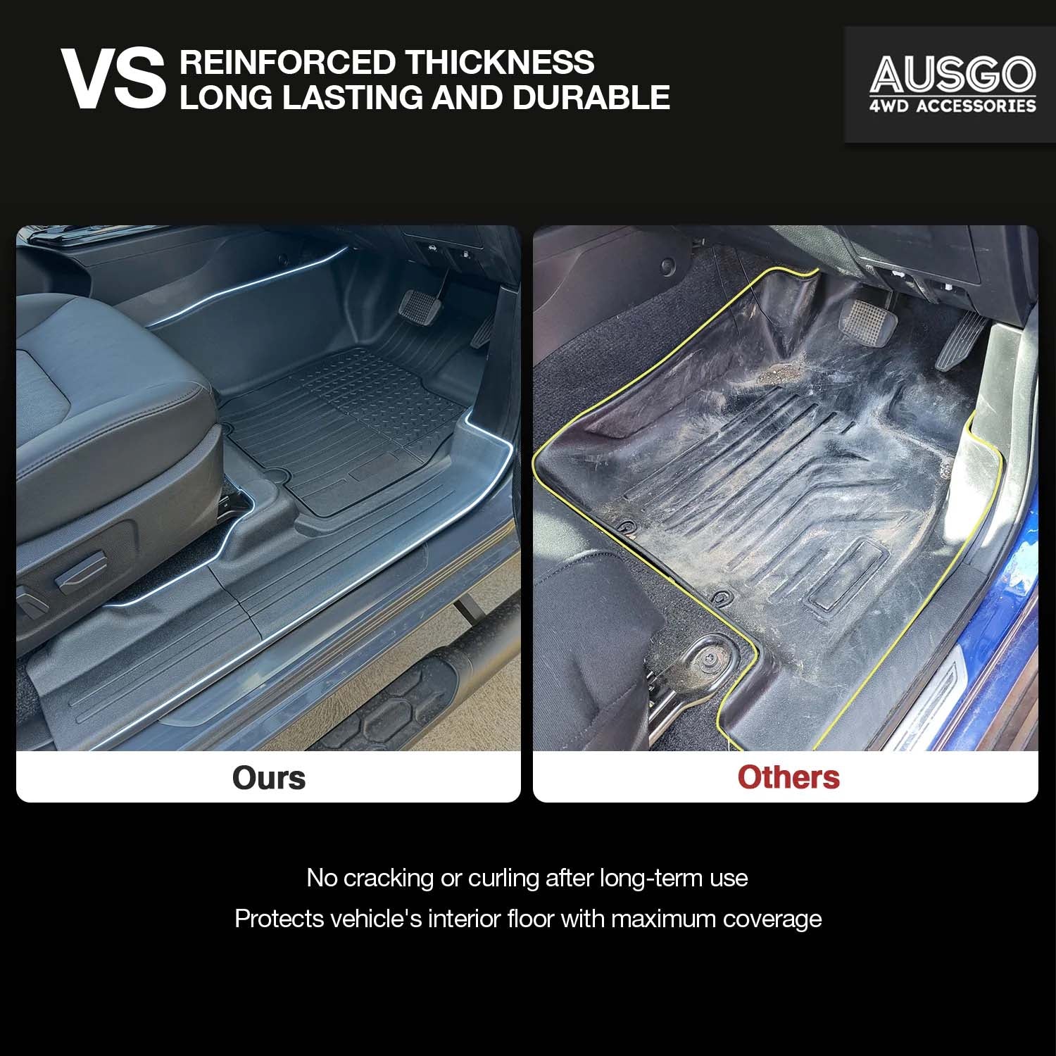 AUSGO outperforms OEM (Original Equipment Manufacturer) mats in fit, durability, and coverage. OEMs are the ones you get when you leave the showroom. While OEM mats typically provide basic cover, AUSGO mats are crafted from enhanced Thermoplastic Elastomer (TPE) materials that have superior wear and tear resistance, waterproofing, and longevity. Additionally, they cover more surface area — including the sides and edges of the vehicle’s door sills, under-seat areas, and footwells — which OEMs don’t.
