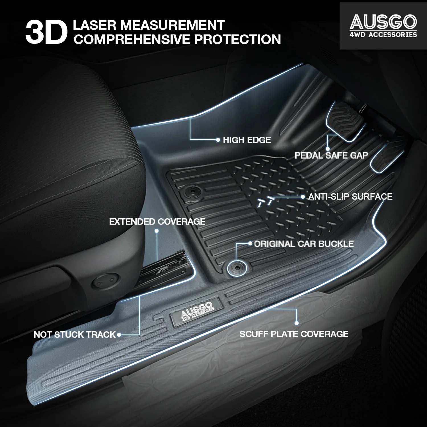 AUSGO outperforms OEM (Original Equipment Manufacturer) mats in fit, durability, and coverage. OEMs are the ones you get when you leave the showroom. While OEM mats typically provide basic cover, AUSGO mats are crafted from enhanced Thermoplastic Elastomer (TPE) materials that have superior wear and tear resistance, waterproofing, and longevity. Additionally, they cover more surface area — including the sides and edges of the vehicle’s door sills, under-seat areas, and footwells — which OEMs don’t.